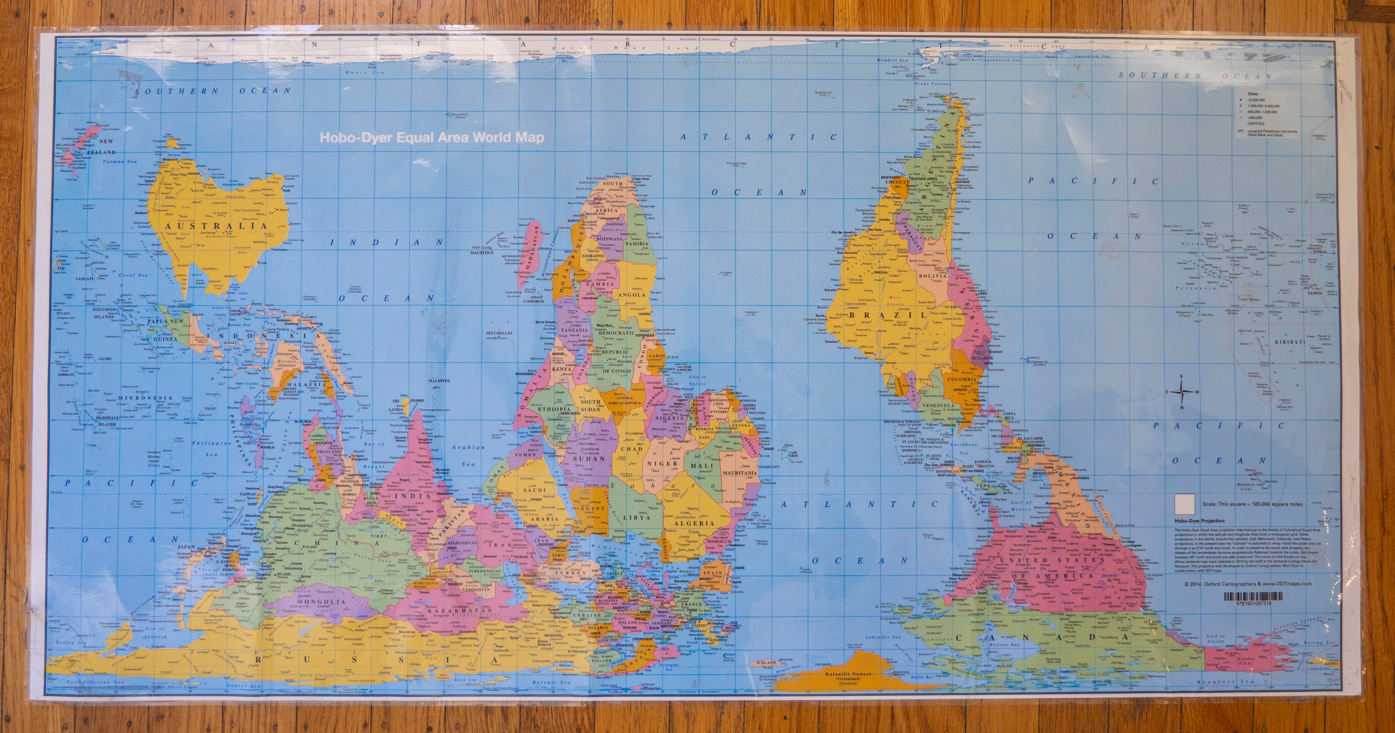 A few years ago, I asked my geographically-inclined brother to gift me a world map for Christmas. I needed some wall decor for my dorm room, and wanted a visual cue to help me practice my own geography knowledge. When I unfurled the glossy map from its cylindrical package, I noticed something funny. At first I thought it was just a quirk, a misprint. All the words were upside-down. That’s silly, I thought. My curiosity led me to look up the title imprinted on the map, Hobo-Dyer Equal Area World Map. I found that this decision was, in fact, intentional: